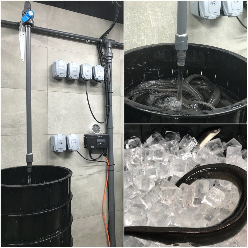 Tateba are used in Japan to store eels in unagi distribution facilities – live unagi are kept in the columns of black plastic tubs called Domaru (each Domaru contains about 5kg of Unagi each). Chilled filtered water streams down from taps located above the columns, trickling down the baskets to keep the eels moist and lively.